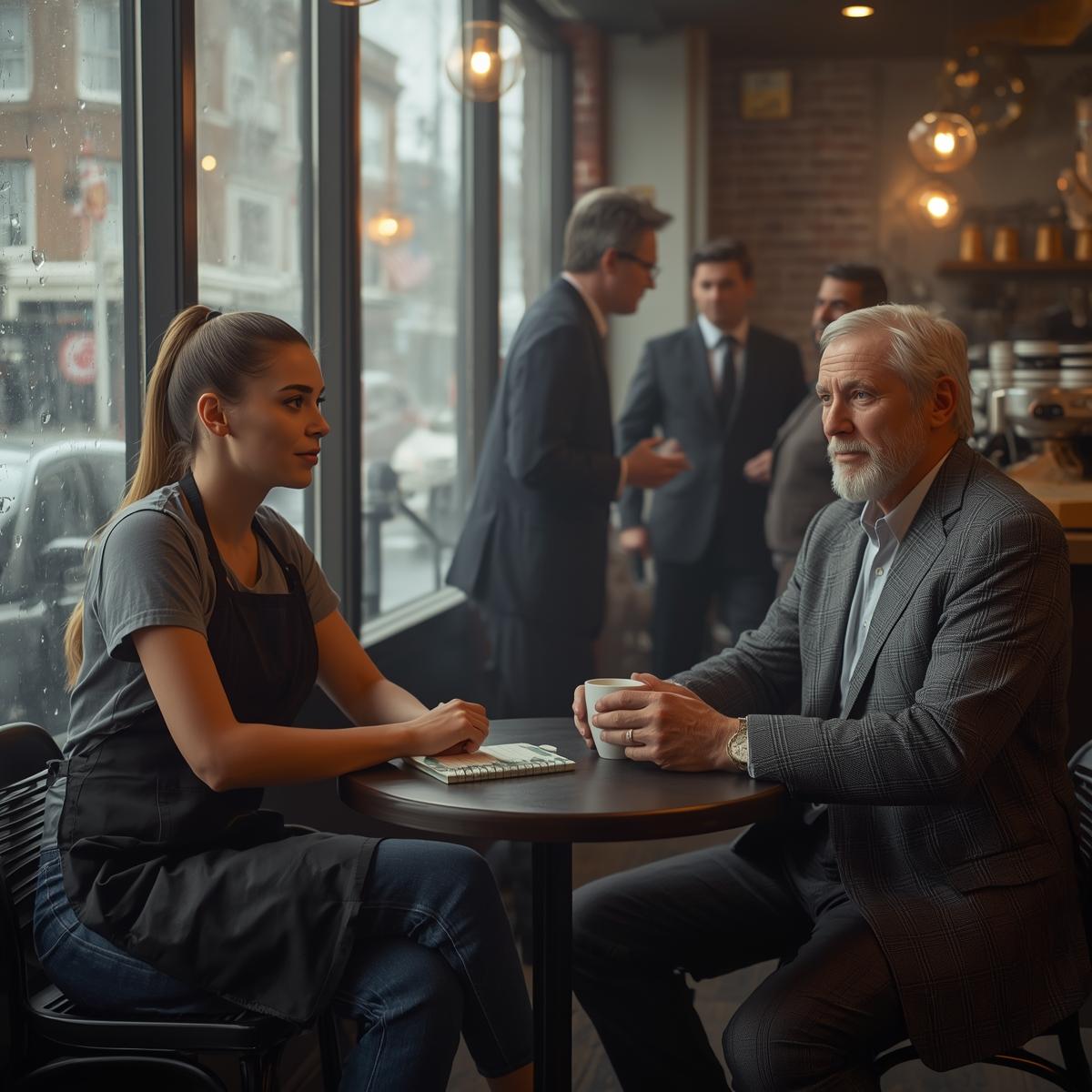 The rest of my shift felt a half step out of sync. Every time I glanced at the window, I saw him there, both hands wrapped around the cup like it was a small fire in a very cold world. He didn’t look at his phone. He didn’t pull out a laptop. He just sat, watching the rain, occasionally closing his eyes as if listening to something only he could hear.