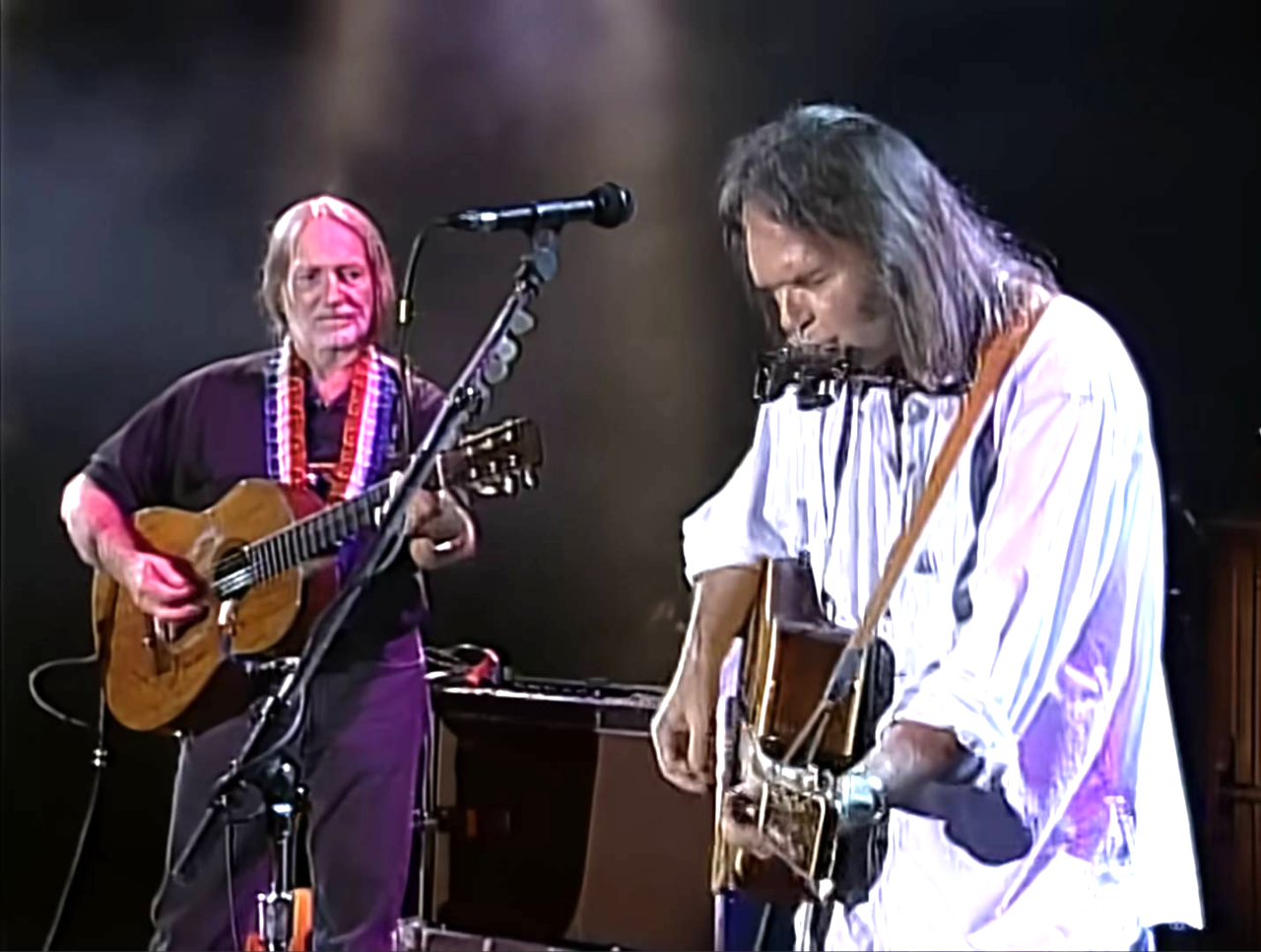 As Neil Young began the song, the crowd was already excited. But fans quickly noticed something else—Willie Nelson standing nearby, watching closely. Then came the moment everyone started talking about. Willie gave Neil a look—quiet, calm, and full of meaning.
