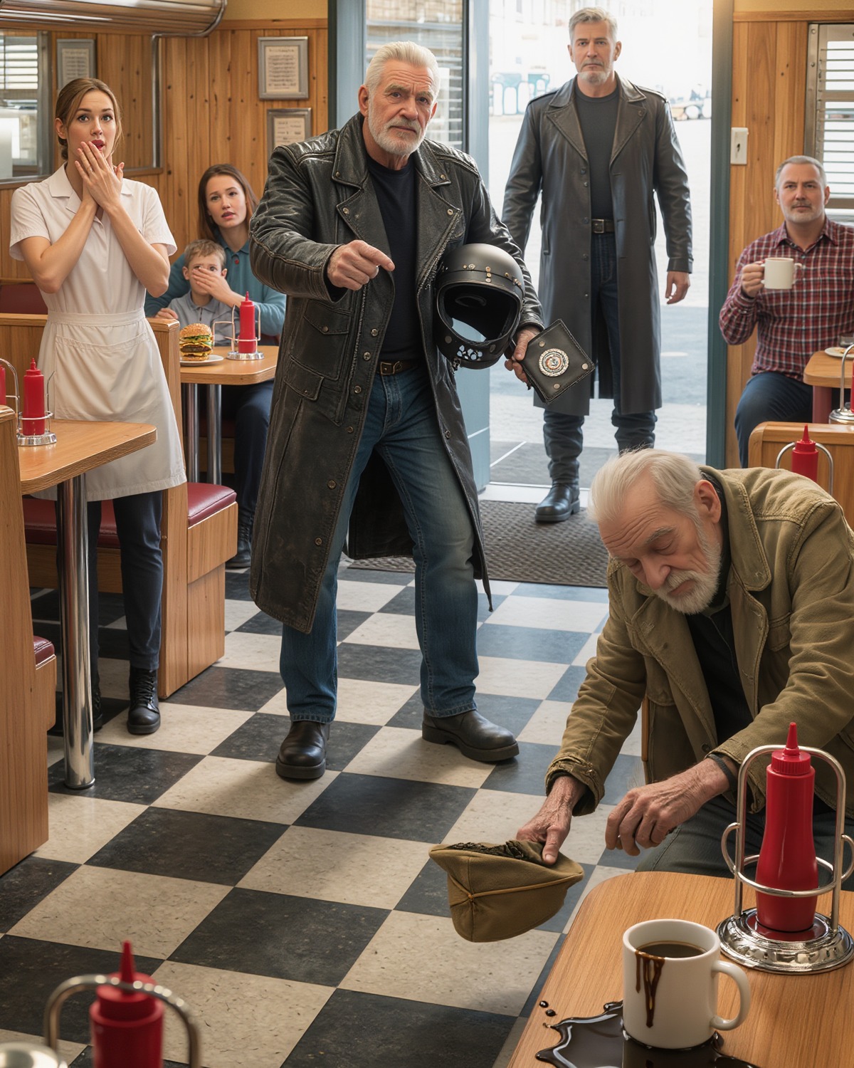 The door banged open, letting in a gust of cold air. A motorcyclist stomped in, heavy boots striking the floor. His eyes swept the room until they landed on the old man.