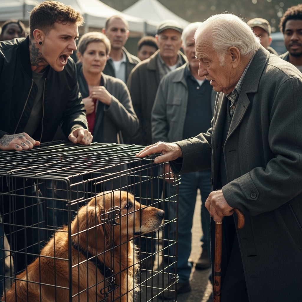 The sound of his cane hitting the concrete echoed as he limped toward the cage. People stared, murmured. The dog trader turned, irritated.