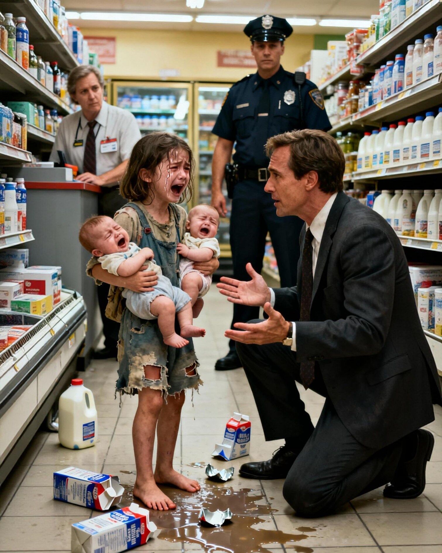 “I—I’m sorry, sir,” she whispered, pulling out the milk with trembling hands. “I was going to put it back. My brother and sister are just hungry—”
