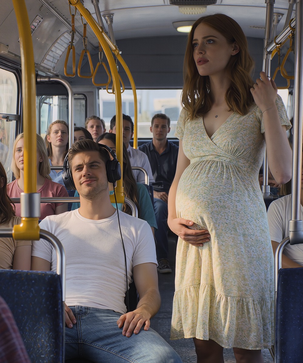 The city bus rattled its way down a narrow street, every seat taken, every handlebar clutched. The air inside was heavy—thick with heat, chatter, and the faint squeak of old brakes. At the next stop, a young woman stepped aboard. She wore a simple summer dress, her steps careful, her hands gently resting on her rounded belly. Seven months pregnant, she carried herself with quiet dignity, but the strain on her face made it clear: standing would not be easy.