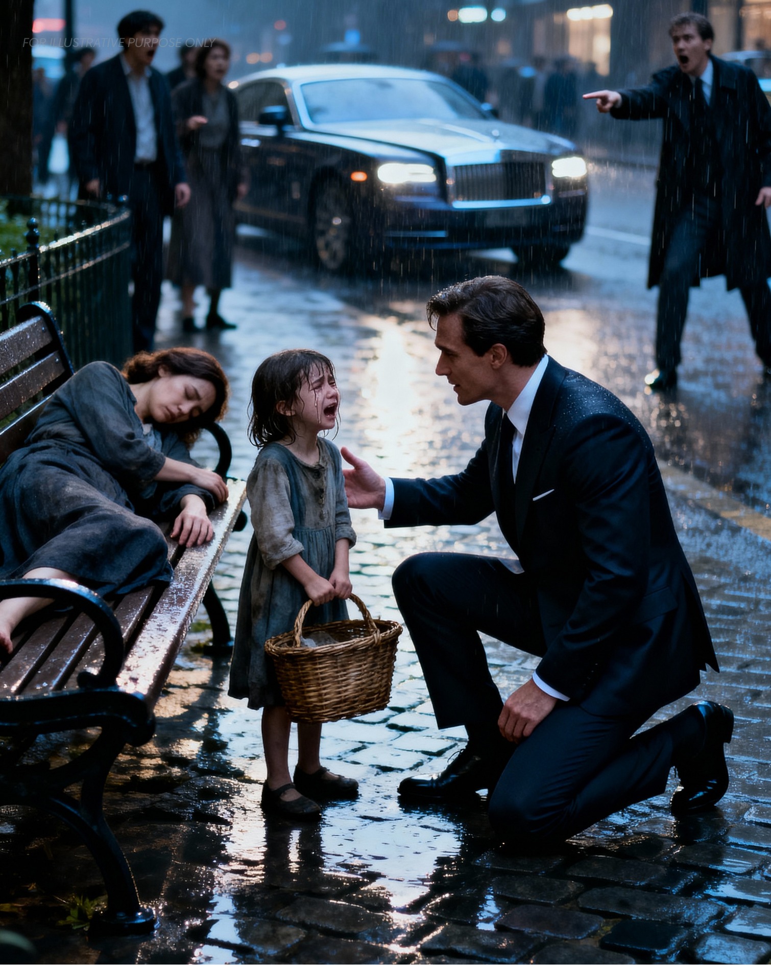 Then headlights cut through the curtain of rain. A sleek black car slowed at the curb — the kind that didn’t belong in their world. A man stepped out, tall, his coat expensive, his face shadowed beneath an umbrella.