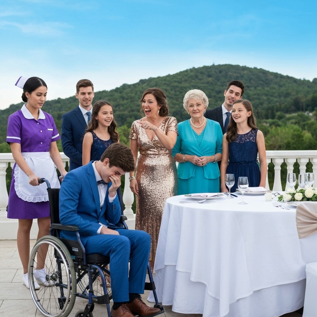 The breaking point came one evening during a lavish terrace party. Cassandra, dressed in diamonds and silk, laughed loudly in front of her friends. With a cruel smirk, she pointed at Adrien sitting in his wheelchair. “Look at him now,” she joked, her voice cutting like glass. Guests chuckled nervously, too afraid to contradict her.
