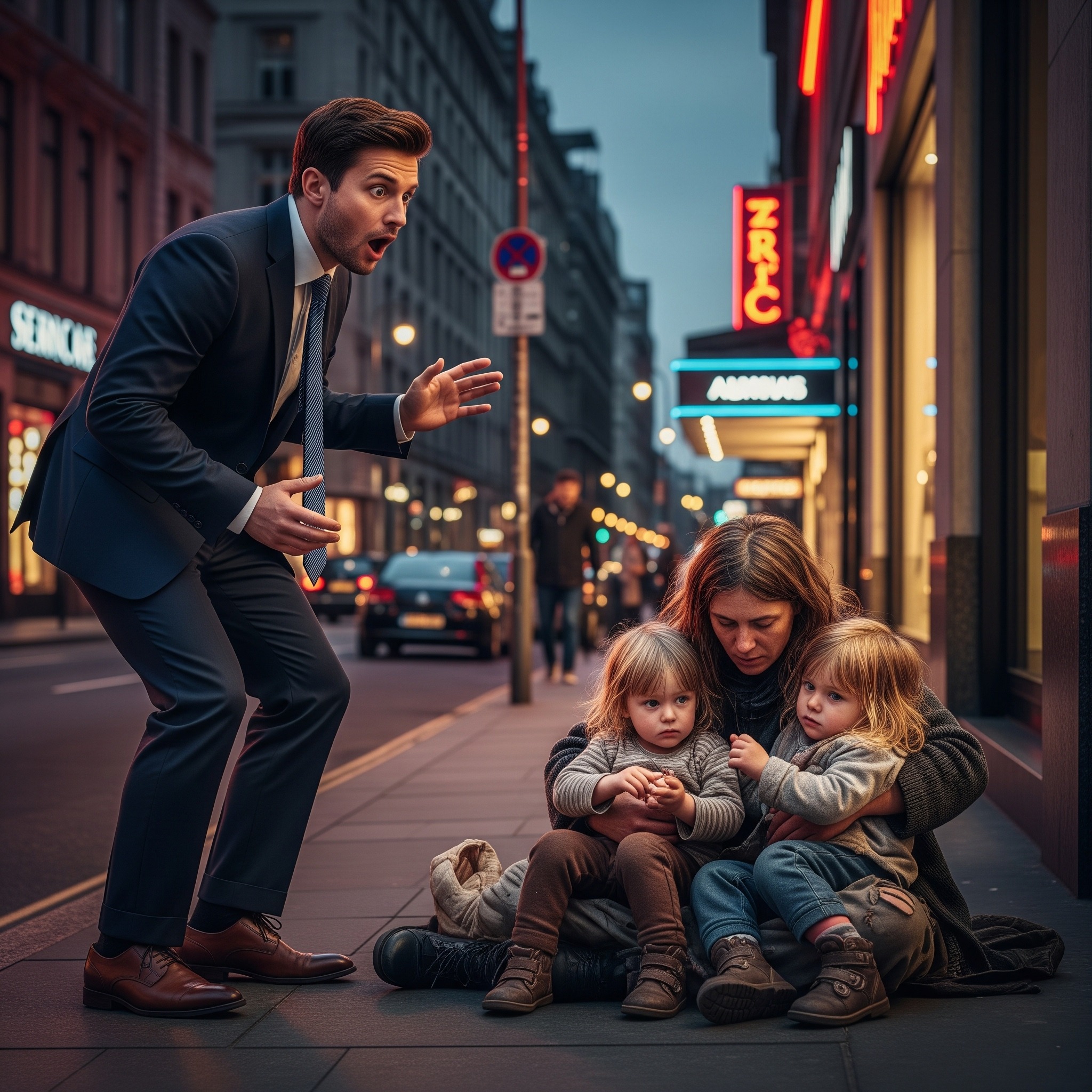 As he crossed the busy street toward his favorite restaurant, a small figure on the sidewalk caught his attention. A woman sat on the cold pavement, her clothes worn thin, her hair unkempt. Beside her were two little girls, no older than four, clinging to her arms. A paper cup sat in front of them with only a few coins.