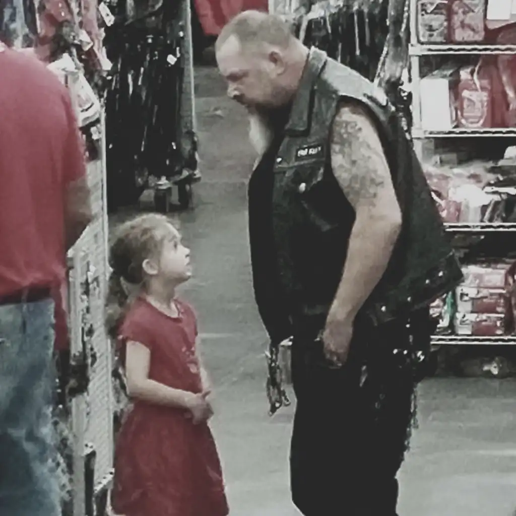 I fumbled for my phone while the biker carried the child to customer service, his brothers from the MC – four more leather-clad giants – forming a protective wall around them.