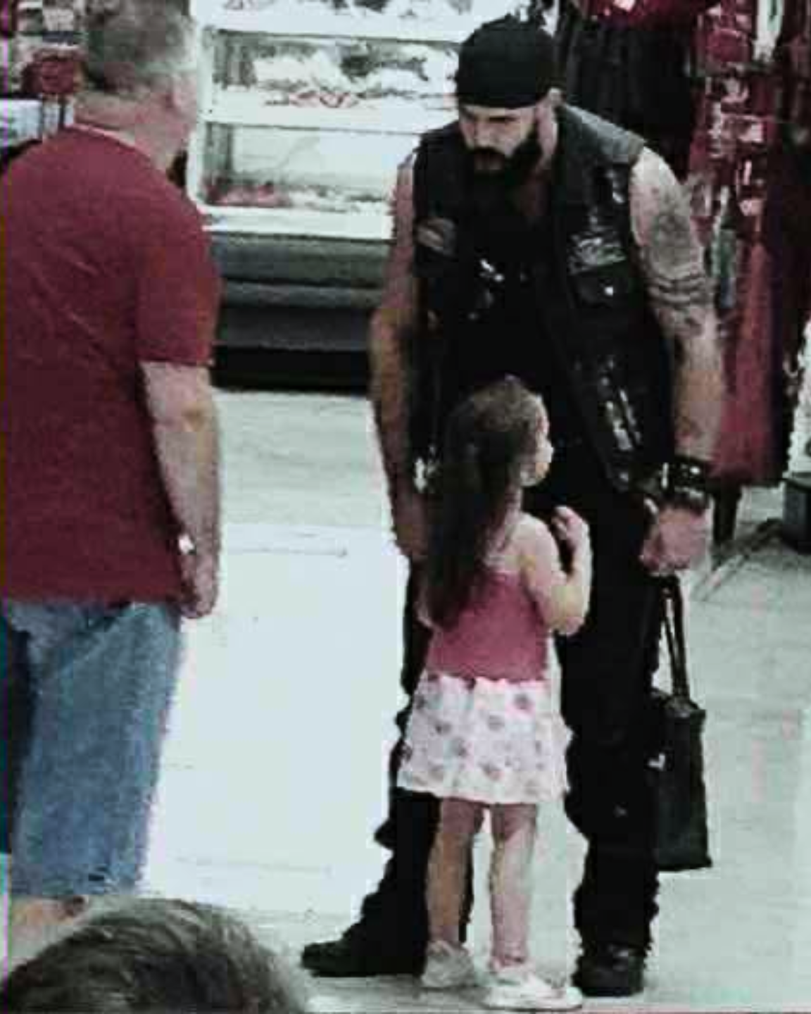 It was just another busy afternoon at Walmart, with carts clattering and people rushing to get their groceries, until a tiny six-year-old girl ran straight into the arms of a giant biker in a Demons MC vest.