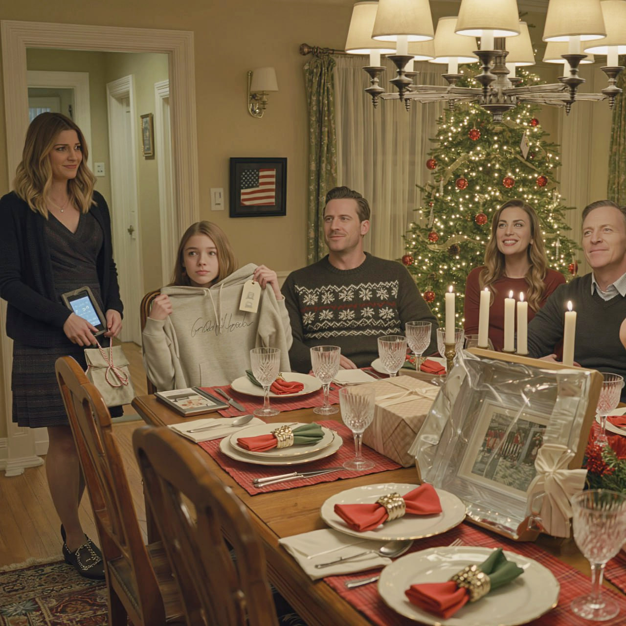 Ruth, my sister-in-law, Vanessa, kissed my cheek with precision. Perfect lipstick, perfect smile. Mark, my brother, clapped me on the shoulder like a colleague he tolerated. The house hummed with carols and clatter and the soft clink of dessert forks on china. I set the gifts near Madison and took the seat that always seems to be waiting for me. Corner of the table half-shadowed audience to the show.