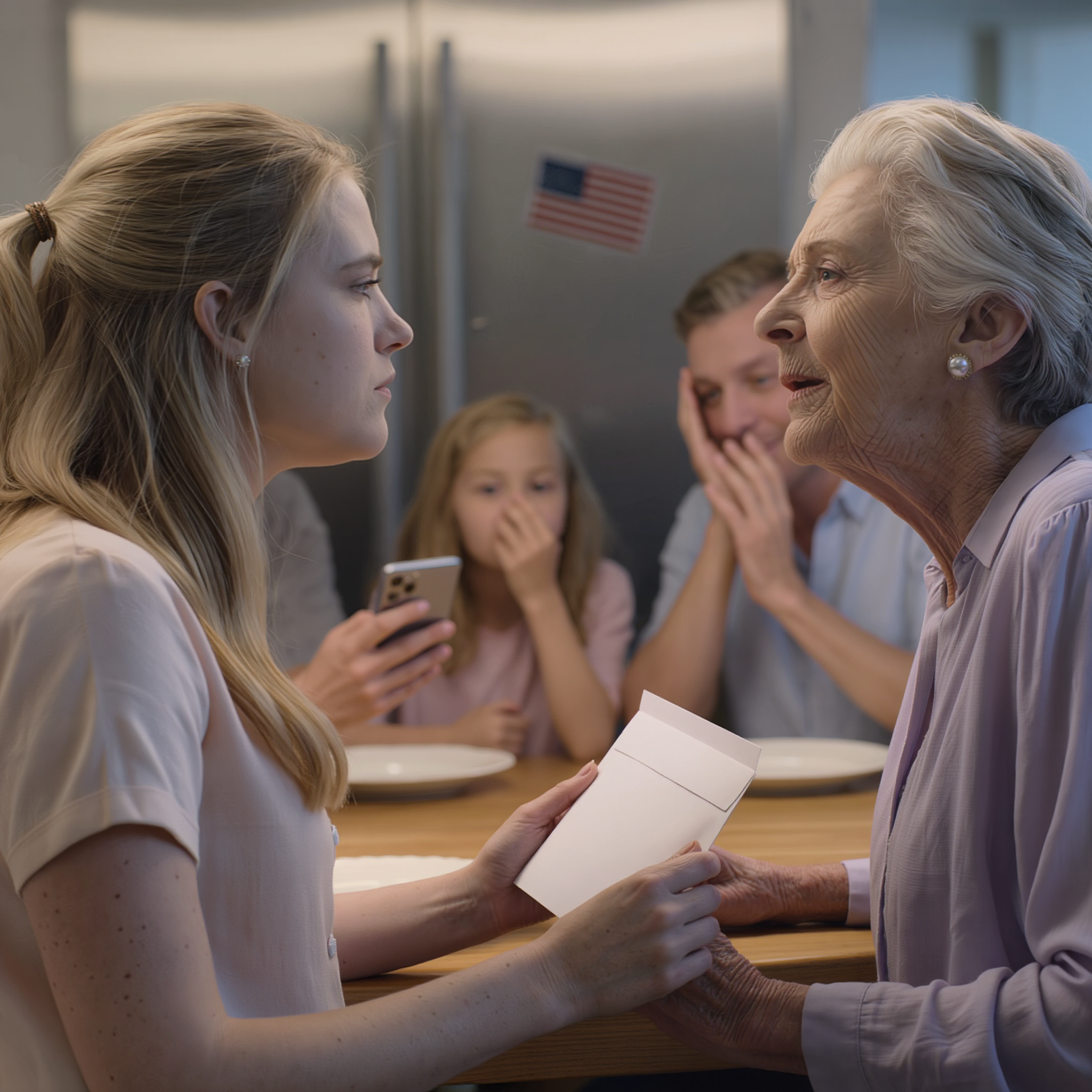 On the day Eleanor arrived, the air smelled like roasted chicken and polished wood. My mother had dragged out the good dishes we only used for holidays—white plates with a thin silver rim that she always said were “too nice” for regular dinners. The tablecloth had been ironed within an inch of its life. Even the flag magnet on the fridge had been straightened.
