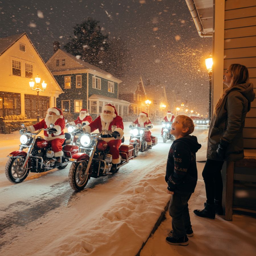 Through the swirling flakes, he saw them — a line of Santa Clauses on motorcycles, headlights cutting through the night like stars. Mason’s eyes widened, and his heart skipped.