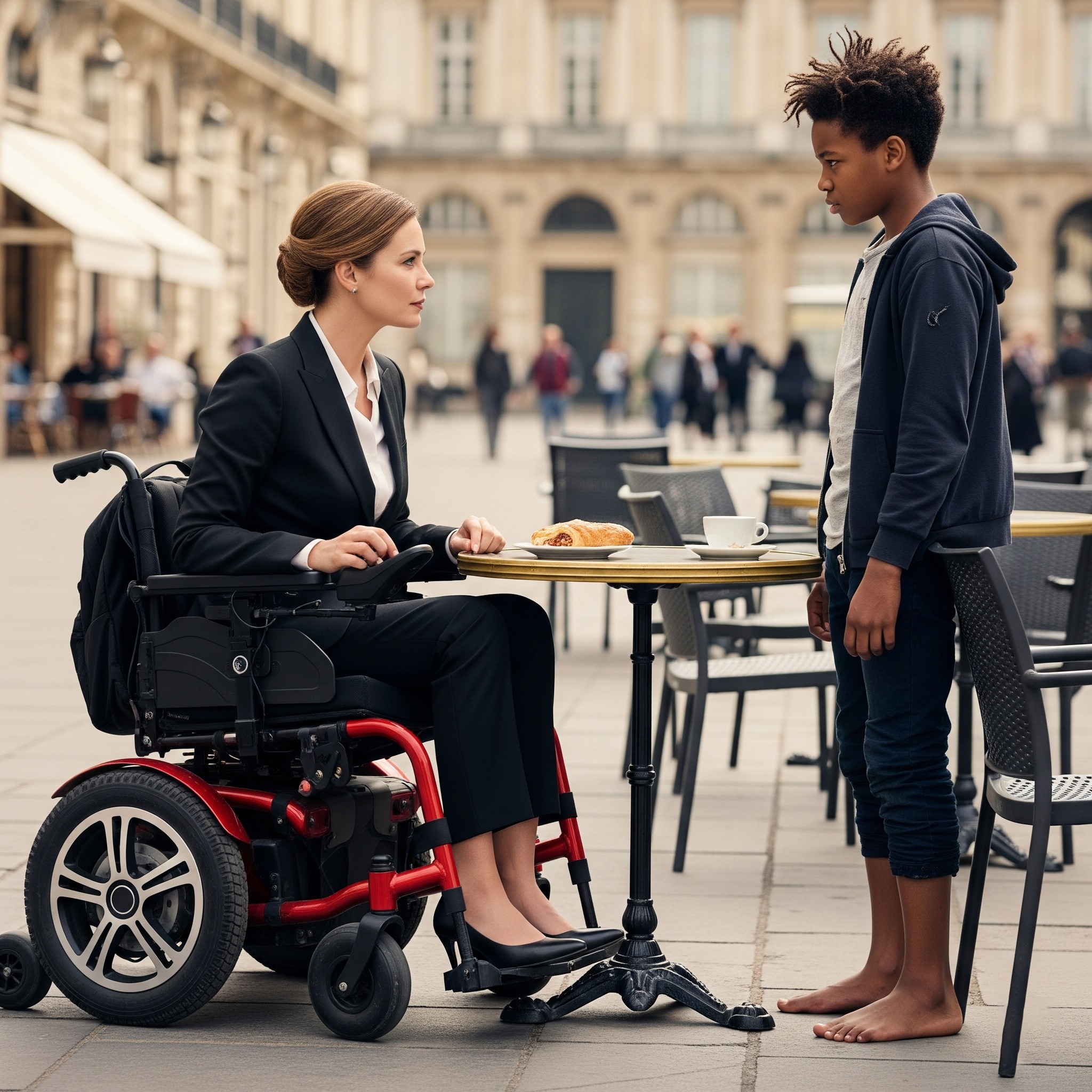 When he saw Caroline wheeling herself to a nearby cafe, Marcus approached cautiously. “Excuse me, ma’am,” he said, voice barely above a whisper. Caroline looked down, curiosity flickering in her eyes. “Can I… can I cure you in exchange for that leftover food?”