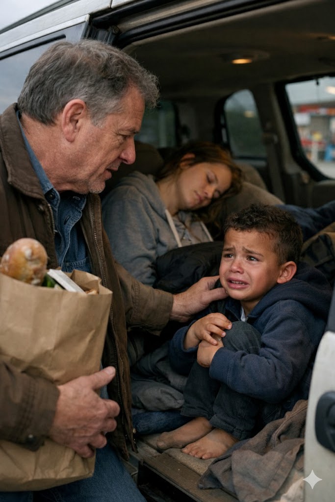 I found Lila in a rust-eaten van parked at a nearly deserted gas station just outside town. My grandson, Kairo, slept in the back seat, curled against the door, his tiny fists clenched as if even in sleep he was bracing for danger. His pale face looked too small for the fear that lived on it.