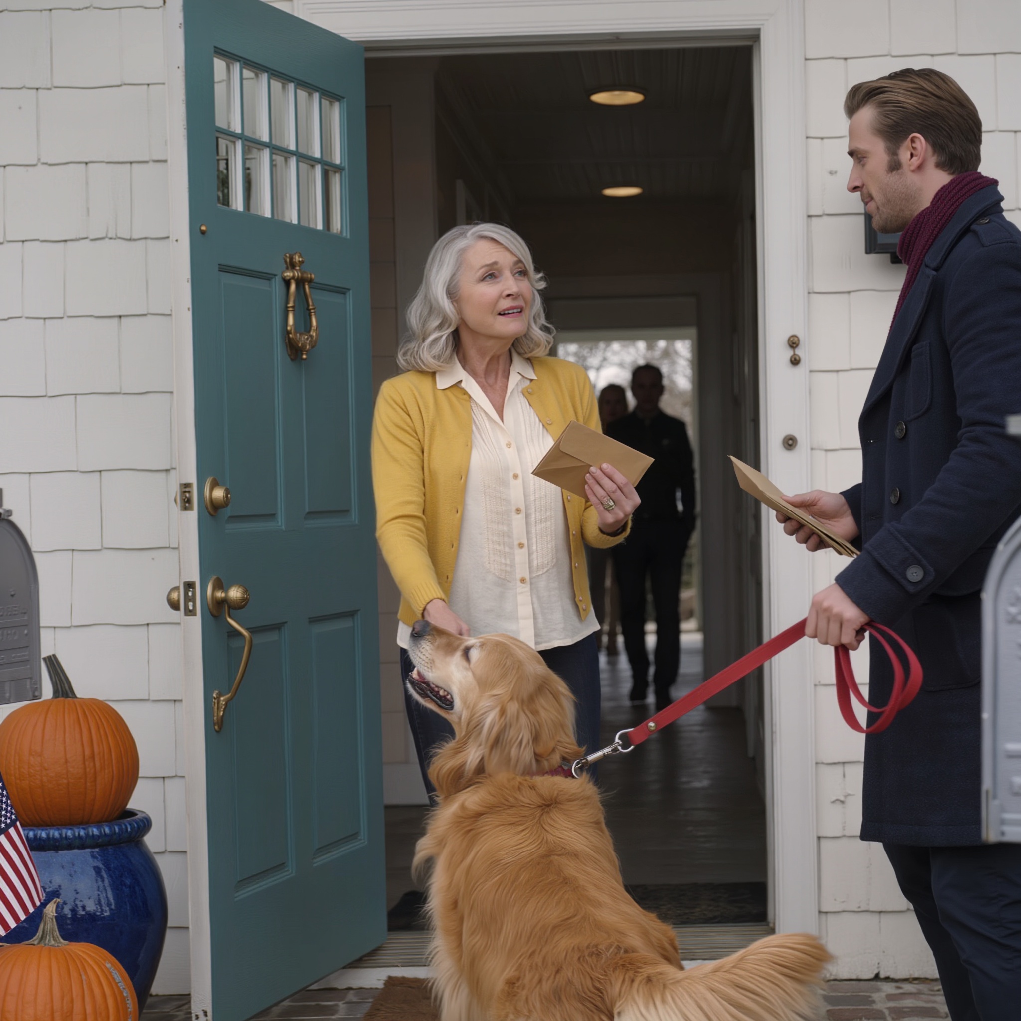I took my time rising from the kitchen table, smoothing my slacks before walking unhurriedly toward the front door. The scene that greeted me was exactly as I’d imagined during my sleepless night. Steven stood frozen in the doorway, face ashen. Behind him, I could see Paul Matthews—not the doddering old man my children had described, but a commanding presence in an impeccable suit, his silver hair and fit physique giving him the air of someone accustomed to authority. Beside him, tail wagging frantically at the sight of me, was Max, straining against his leash; flanking them were two stern-faced men in dark suits, official-looking badges glinting on their belts.